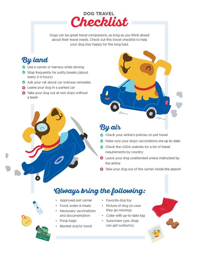 Visit your veterinarian before you depart to make sure your dog is up-to-date on vaccinations. You also want to make sure your pup is protected from ticks, mosquitoes, and other insects. Just like with humans, dogs can fall ill from Lyme disease and West Nile virus. Talk to your vet about the best precautions and flea and tick medicine to take.